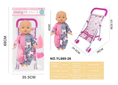 26CM制手推车遮阳布 配:娃娃吹瓶身体,喝水尿尿带4声IC,配件:奶瓶+奶嘴(包3粒AG13)