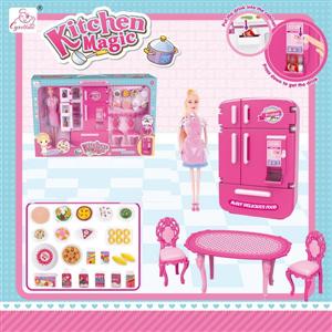 多门冰箱售货机+桌椅+面包配件+粉围裙芭比 芭比色 灯光声音