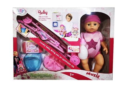 新款16寸喝水拉尿搪胶娃带推车,马桶,餐盘,尿裤,6声IC