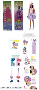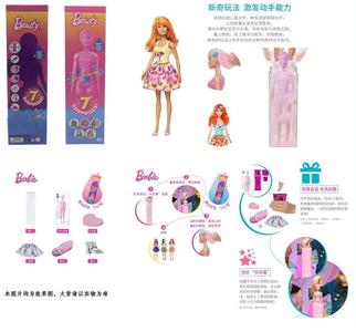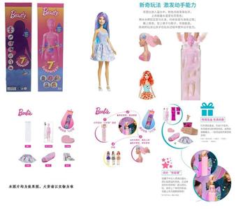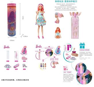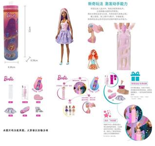 第1代11.5寸实身惊喜变色芭比。带5样不同的惊喜配件,娃娃360度旋转,4款随机混装6PCS