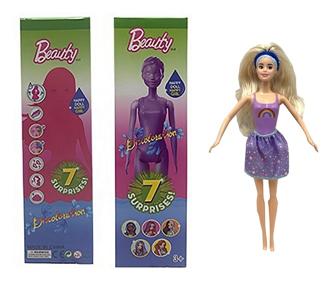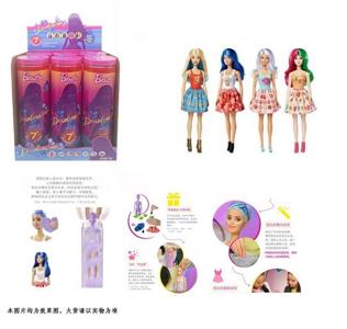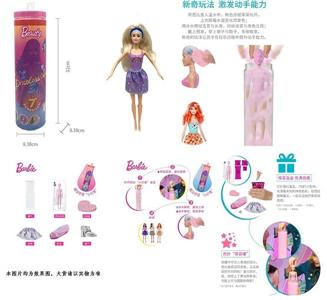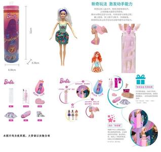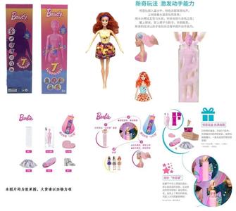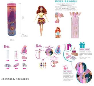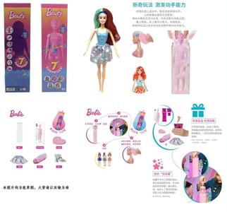 第1代11.5寸实身惊喜变色芭比。带5样不同的惊喜配件,娃娃360度旋转,4款随机混装6PCS