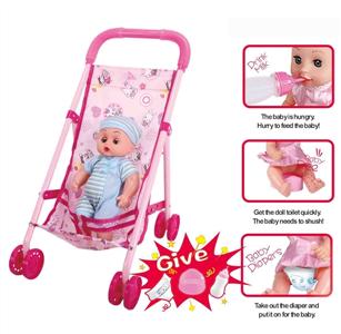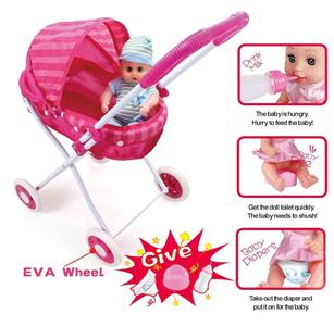 婴儿手推车+12"公仔(娃娃喝水尿尿,搭配奶瓶,马桶和尿不湿)