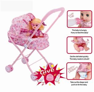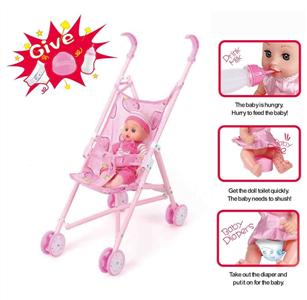 婴儿手推车+14"公仔(娃娃喝水尿尿,搭配奶瓶,马桶和尿不湿)