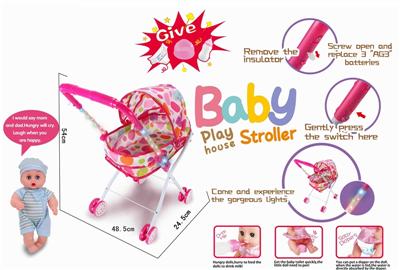 彩色灯光扶手婴儿铁制遮阳斜躺手推车+14"女娃(娃娃喝水尿尿,搭配奶瓶,马桶和尿不湿)